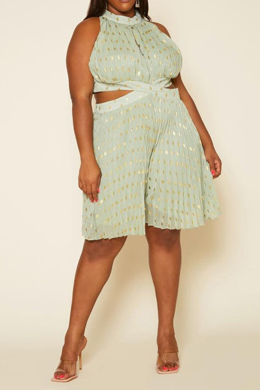Plus size women's romper featuring pleated style, halter neck hem with a front keyhole, waist cut out detail & back zipper and button closure.(100% Polyester) Low Stretch Model Info: Height: 5'10" Bust: 42" Waist: 37" Hip: 54" Model is wearing...